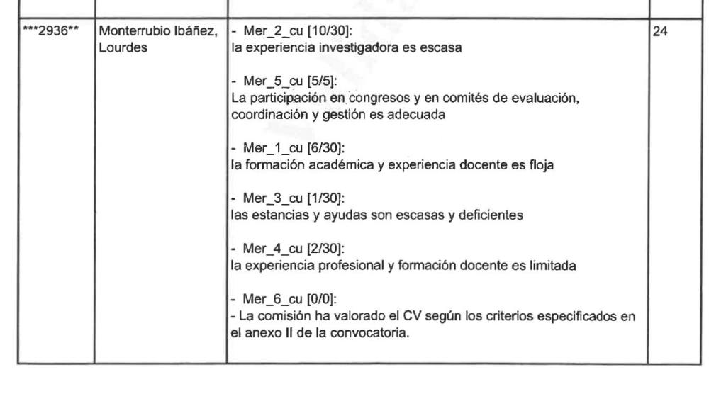 Ni siquiera se molestan en revisar la matemática básica, y el total de 100 puntos resultan que son 125. Los múltiples «no consta» son falsos, claro que constaban, por eso es mejor no entregar el expediente administrativo. Decir que mi investigación era escasa… hay que tener muy poco vergüenza ¿Alguien puede defender que 5 años de licenciatura, tres de DEA, seis de tesis doctoral y cuatros años de experiencia posdoctoral sean “baremados” de semejante manera? ¿No es esto un insulto inadmisible a los investigadores e investigadoras y a la universidad pública española? Es la ceremonia de la humillación. Los tribunales de las plazas no se contentan con inflar la baremación de la persona beneficiaria del dedazo, además otorgan baremaciones humillantes a los candidatos y candidatas «ajenos». Es la forma preventiva de descalificación ante la posible reclamación. Parece ser que en la Universidad Rey Juan Carlos no consideran necesario establecer unos criterios de evaluación y una baremación de los candidatos y candidatas a partir de ellos. ¿Para qué van a perder el tiempo en crear y manipular toda la documentación del procedimiento (obligatoria por ley) cuando el resultado, el dedazo, va a ser el mismo? Se ahorran el papeleo. Este es el nivel de impunidad de sus actuaciones.
